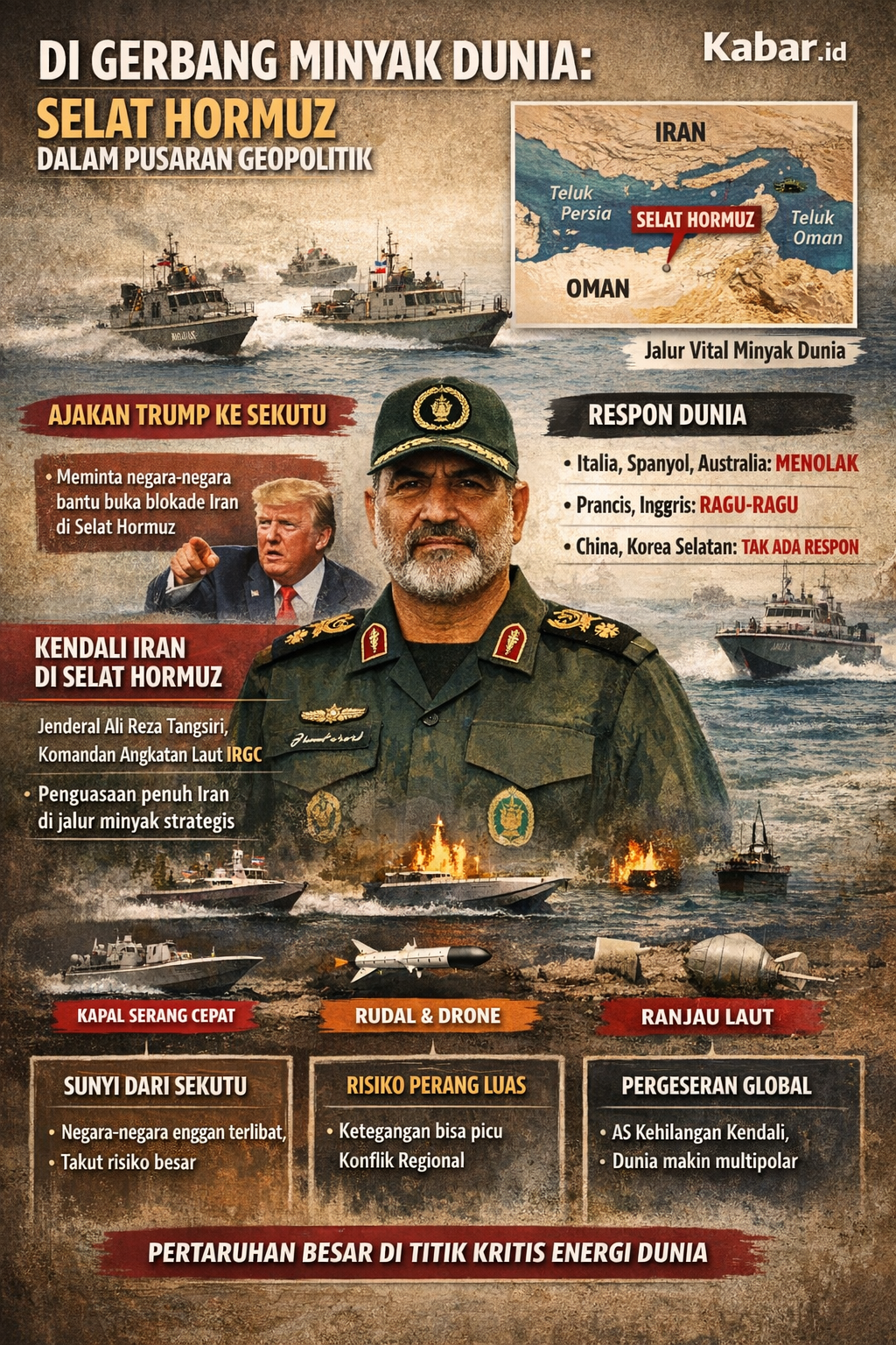 Dalam konteks ini, nama Alireza Tangsiri muncul sebagai figur sentral—komandan Angkatan Laut Garda Revolusi Iran yang memahami setiap lekuk perairan itu seperti halaman rumahnya sendiri.